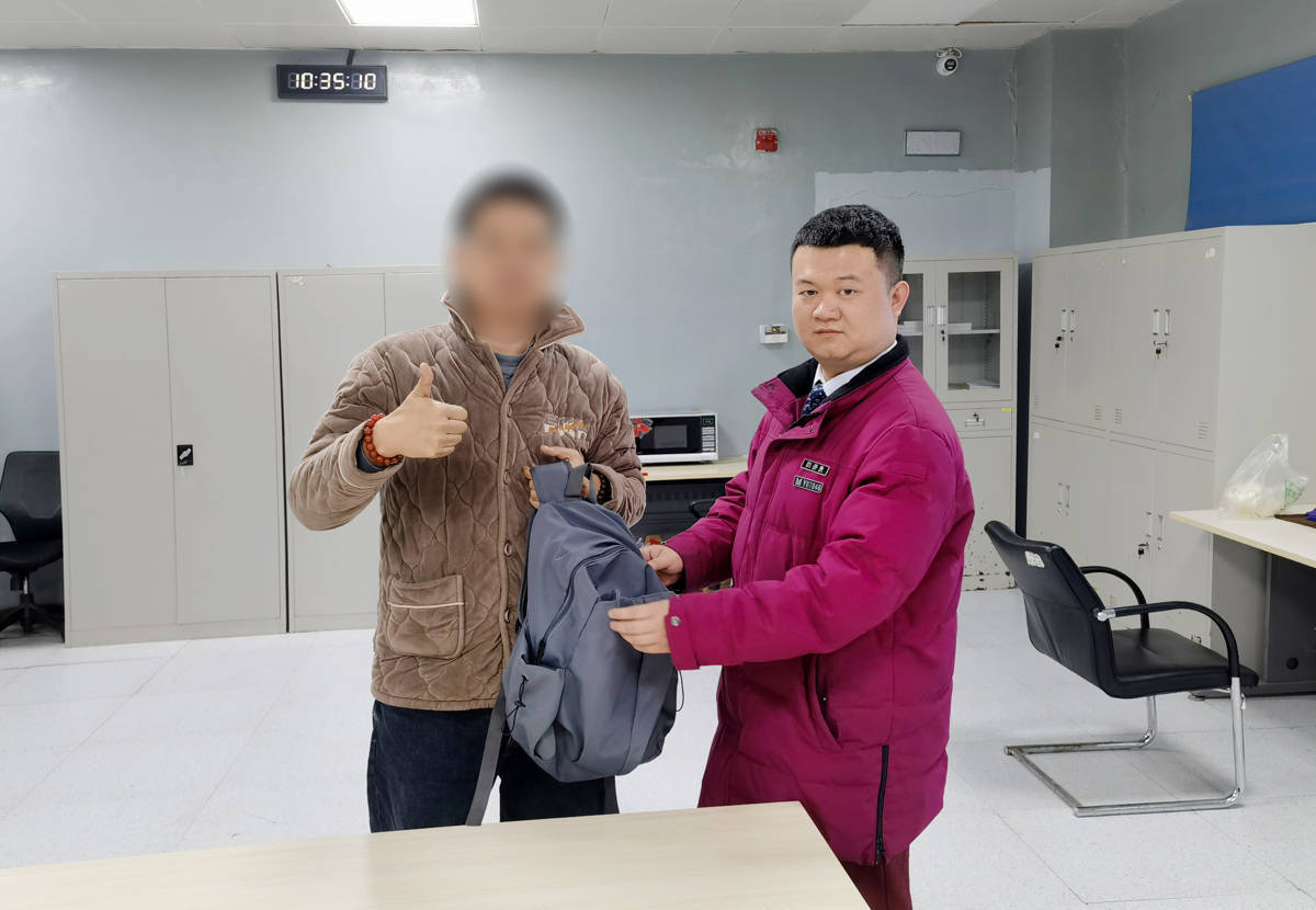 正在巡站的值班站长何栋见有人敲门,上前打开门了解详细经过,推算列车还有一站就到终点站武汉火车站。立即联动武汉火车站行车值班员马亿,安排工作人员到指定车门处寻找白色双肩包。