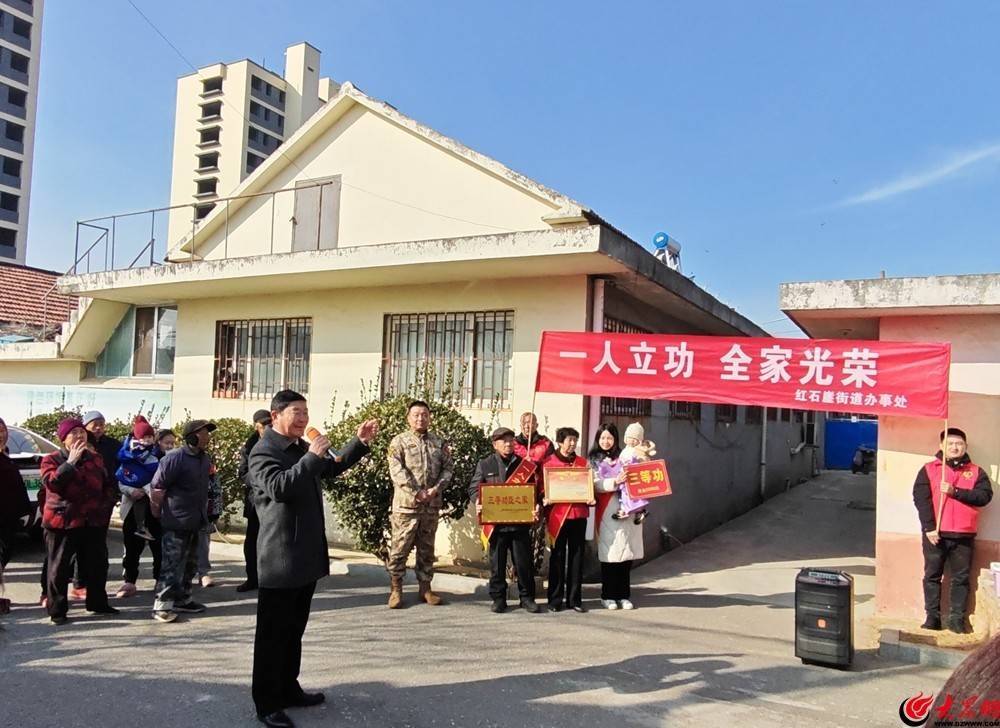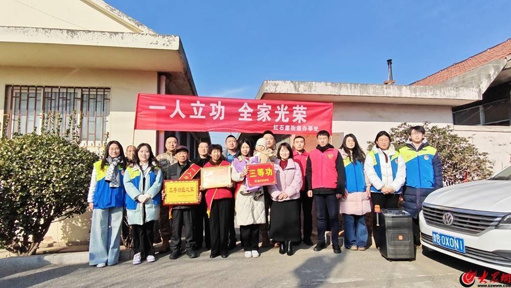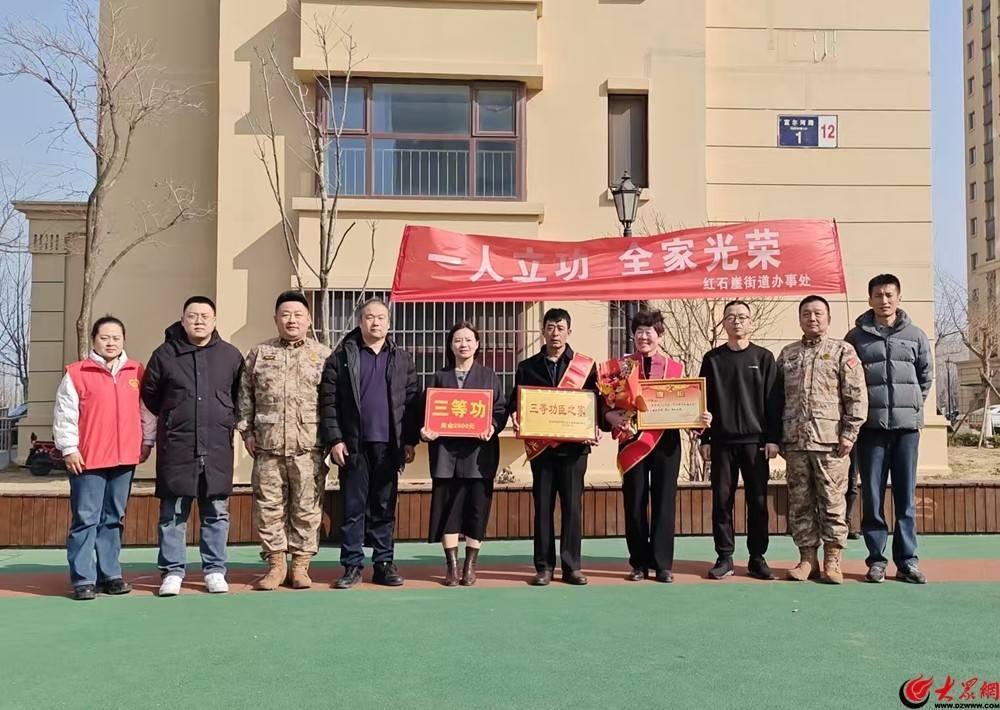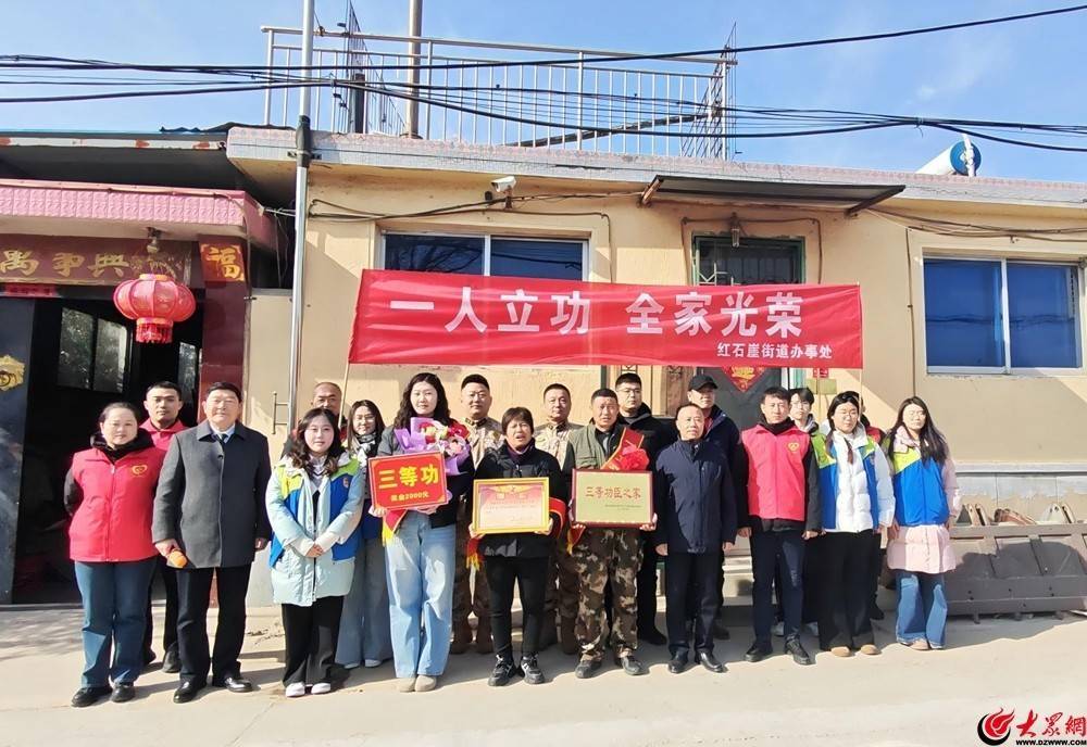 r锣鼓喧天庆功勋,喜报登门暖军心。近日,青岛西海岸新区红石崖街道退役军人服务站、武装部联合龙泉、金凤山、茂山路、福莱社区,携手退役军人志愿服务联盟,组建送喜报队伍,先后前往龙泉河西、宋家茔、城子埠、东郭经合社,为4名荣立三等功的现役军人家庭送上立功喜报与慰问金,以庄重仪式致敬军营功臣,以暖心关怀温暖军属人心。